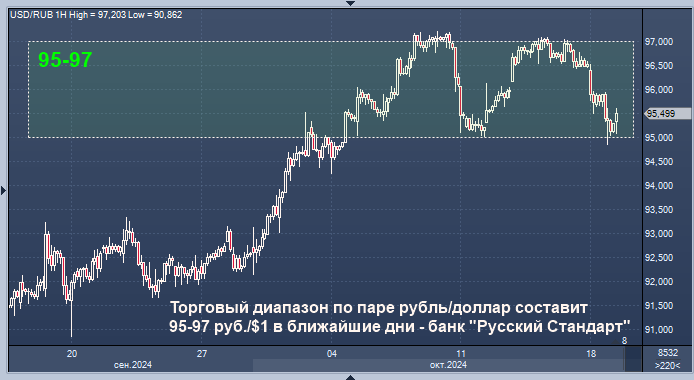 Торговый диапазон по паре рубль/доллар, скорее всего, составит в ближайшие дни 95-97 руб./$1, по паре рубль/евро - 103-105 руб./EUR1, полагает директор департамента операций на финансовых рынках банка "Русский Стандарт" Максим Тимошенко.