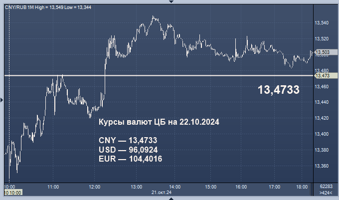 Китайский юань развернулся вверх после снижения в первой половине сессии и растет на Московской бирже в понедельник днем. Рубль возобновил снижение, несмотря на укрепление нефти и ожидание дальнейшего ужесточения денежно-кредитной политики на заседании Банка России в пятницу, 25 октября. Торги долларом и евро не проводятся на Московской бирже с 13 июня из-за санкций. В связи с этим наиболее подходящими ориентирами колебаний курса (в том числе для внебиржевого рынка) являются котировки однодневного фьючерсного контракта с автопролонгацией на курс "доллар США - российский рубль" (USDRUBF) и такого же контракта на курс "евро - российский рубль" (EURRUBF), пишет Интерфакс.
