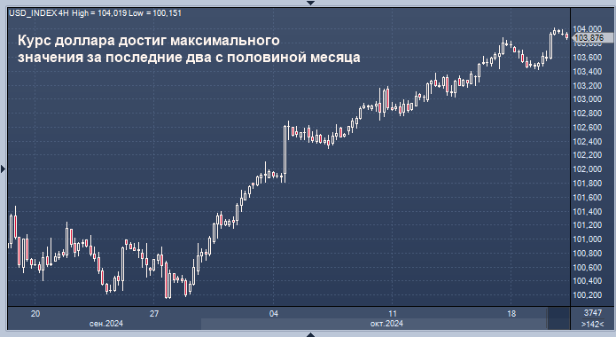 Индекс доллара, который измеряет курс американской валюты по отношению к шести другим валютам, в последний раз составлял 103,93 в азиатские часы, достигнув в понедельник 104,02 — самого высокого значения с 1 августа. Индекс продолжает расти, увеличившись более чем на 3% за месяц.