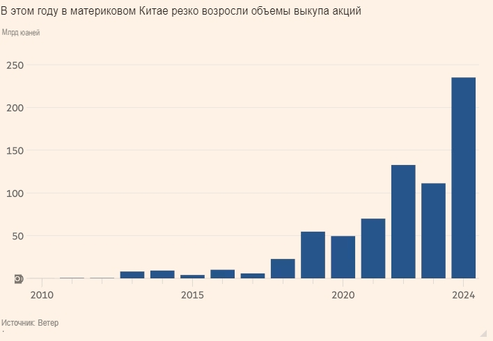 По данным китайского поставщика финансовых данных Wind, в 2024 году объём обратного выкупа акций на материковом рынке составил 235 млрд юаней (33 млрд долларов США), что более чем вдвое превышает показатель прошлого года и значительно превышает предыдущий рекорд в 133 млрд юаней в 2022 году.