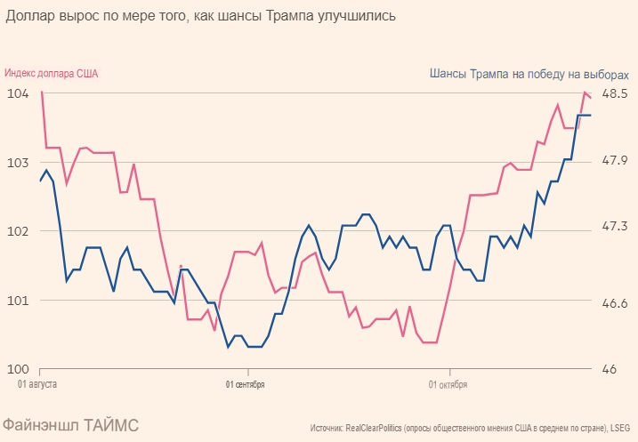 Однако трейдеры и аналитики говорят, что снижение шансов на второй срок Трампа в должности президента США подстегнуло рост курса доллара. Это связано с тем, что планы бывшего президента ввести пошлины на импорт, как ожидается, приведут к росту инфляции и процентных ставок в случае его победы 5 ноября.