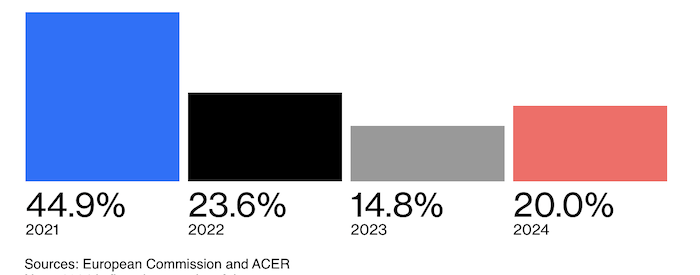 Да, Европа теперь значительно меньше зависит от России, чем раньше. До конфликта Россия обеспечивала 45% европейского импорта газа; в прошлом году ее доля на рынке упала до 15%. Однако дальнейшее снижение прекратилось, и зависимость теперь немного увеличивается. В этом году на Россию приходится около 20% всего импортируемого в Европу газа.