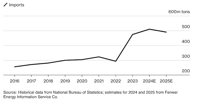 Другие наблюдатели ожидают, что импорт Китая снизится в 2025 году. Китайская консалтинговая компания Fenwei Energy Information Service Co. прогнозирует годовое снижение на 4% до 490 миллионов тонн, по словам аналитика Эми Сюй.