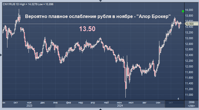"Рубль в паре с юанем продолжает консолидацию чуть выше отметки 13,5 руб. за юань. Повышение ключевой ставки ЦБ РФ в октябре может дать сильный, но краткосрочный импульс роста российской валюты. Она также сейчас получает поддержку от налогового периода. Однако в ноябре, особенно во второй половине месяца, ждем продолжения плавной девальвации рубля", - пишет эксперт в комментарии.