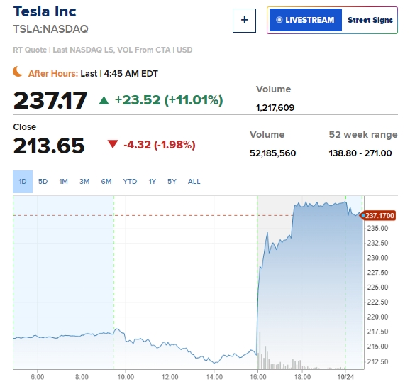 В среду компания Tesla сообщила о результатах своей деятельности за третий квартал, которые превзошли ожидания аналитиков, хотя выручка оказалась немного ниже ожидаемого уровня. Акции компании продемонстрировали значительный рост на 12% в ходе дополнительных торгов.