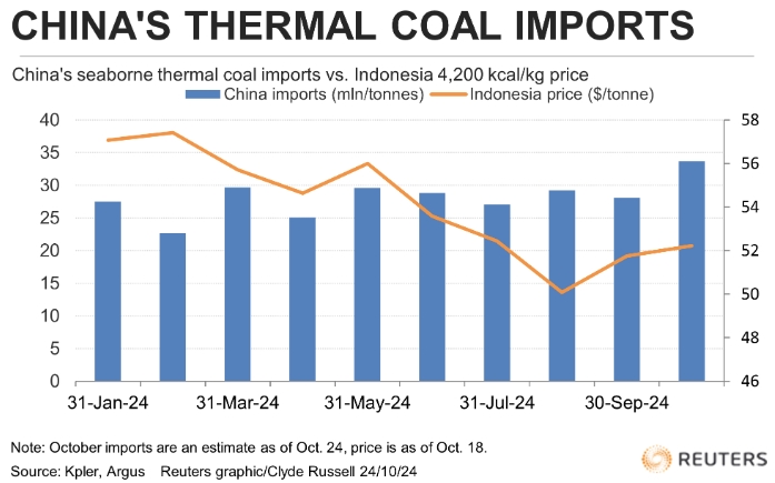 Скачок импорта энергетического угля, используемого в основном для выработки электроэнергии, в октябре во многом был компенсирован ростом поставок из Индонезии, крупнейшего в мире экспортера этого вида угля.