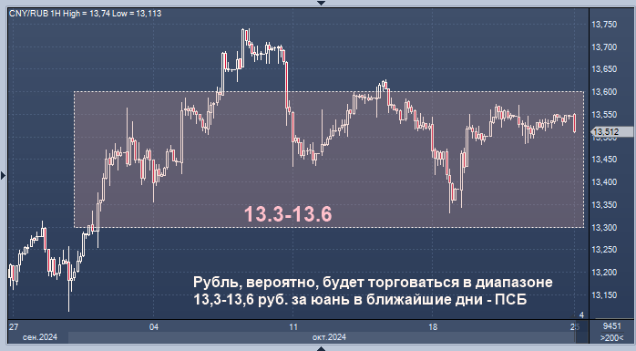 Пара юань/рубль, вероятно, будет торговаться в диапазоне 13,3-13,6 руб. за юань в ближайшие дни, считает начальник отдела экономического и отраслевого анализа Промсвязьбанка (ПСБ) Евгений Локтюхов.