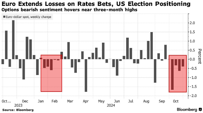 У евро наметился самый продолжительный недельный спад по отношению к доллару за последние восемь месяцев. Давление на евро оказывают растущие ожидания того, что Европейский центральный банк может снизить процентную ставку на полпункта в декабре.