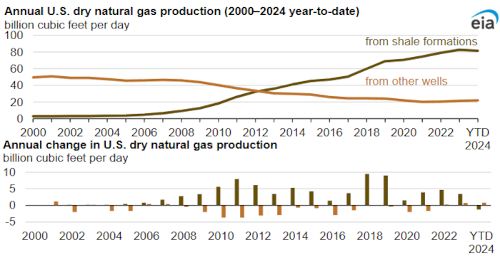Добыча природного газа в США из сланцевых и плотных пластов, на долю которых приходится 79% всей добычи сухого природного газа, за первые девять месяцев 2024 года несколько снизилась по сравнению с аналогичным периодом 2023 года. Если тенденция сохранится до конца 2024 года, то это станет первым годовым снижением добычи сланцевого газа в США с тех пор, как мы начали собирать эти данные в 2000 году.