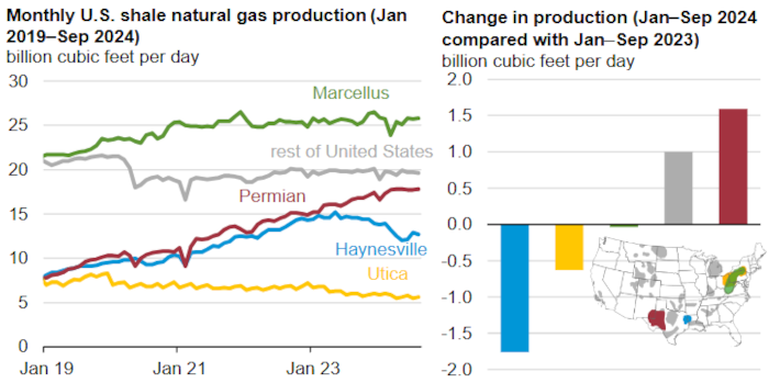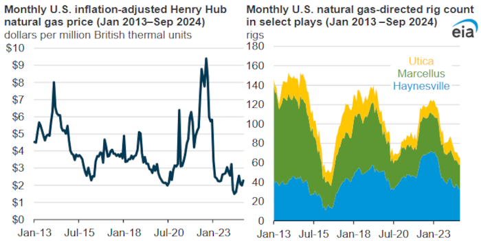 Производители склонны увеличивать или уменьшать количество работающих буровых установок в зависимости от колебаний цен на природный газ. По данным компании Baker Hughes, с конца 2022 года количество активных газовых буровых установок на месторождениях Хейнсвилл, Ютика и Марселлус неуклонно снижается. В сентябре 2024 года в Хейнсвилле работали в среднем 33 буровые установки, что на 53% меньше, чем в январе 2023 года. Число буровых установок, работающих в Хейнсвилле в сентябре, было самым низким с июля 2020 года.