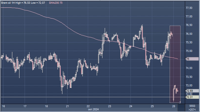 Фьючерсы на Brent упали до $71,99 за баррель в начале азиатских торгов в понедельник, по сравнению с закрытием на уровне $76,05 в пятницу. Позже они восстановились до торгов около $72,73.