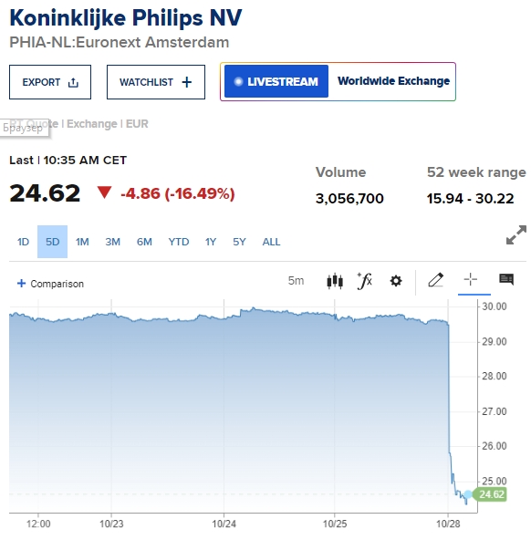 В понедельник утром на европейских торгах акции голландской компании Philips, которая специализируется на производстве товаров для здоровья, упали в цене. Это произошло после того, как компания снизила прогноз по продажам на весь год из-за снижения спроса со стороны Китая.