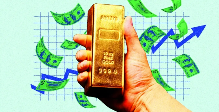 10-унциевый золотой слиток в руке на графическом фоне с изображениями денежных купюр. Getty Images; Алисса Пауэлл/BI