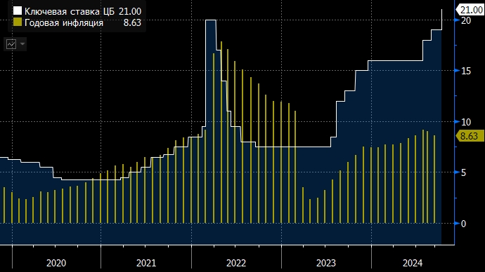 "Главное событие для российского рынка - прошедшее заседание ЦБ РФ, результатом которого стало повышение ставки до 21%, вопреки консенсус-прогнозу 20%, - пишет эксперт в комментарии. - Кроме того, регулятор дал рынку достаточно жесткий прогноз на вектор развития ДКП, предусматривающий дальнейшее повышение ставки. Жесткий сигнал был послан еще в пресс-релизе, где отмечено, что с 28 октября до конца 2024 года средняя ключевая ставка прогнозируется в диапазоне 21,0-21,3%. Такие уровни свидетельствуют о том, что на последнем заседании в декабре есть риск повышения ставки еще на 200 б.п., до 23%".
