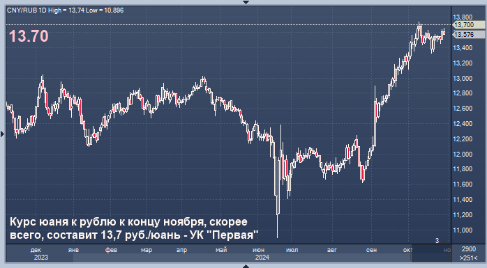 Курс пары юаня к концу ноября, скорее всего, составит 13,7 руб./юань, а доллара - 98 руб./$1, полагает старший аналитик УК "Первая" Наталья Ващелюк.