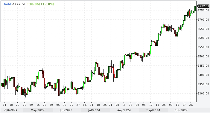 Спотовые цены на золото достигли рекордного уровня 2774,89 долл. США за унцию в ходе американской сессии. Рост цены с начала года превышает 34%.