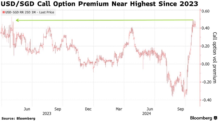 Премия за покупку опциона колл сроком на один месяц, который принесет обладателю профит, если доллар США вырастет по отношению к сингапурскому доллару, в сравнении с опционом пут, достигла максимального значения с мая 2023 года.