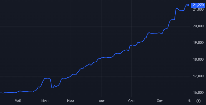 Напомним, что 25 октября Банк России повысил ключевую ставку на 200 б.п. до 21% и дал сигнал о возможности дальнейшего ужесточения ДКП. В настоящий момент денежный рынок (индикатор RUSFAR3M) закладывает в цены повышение ставки на 27 б.п. в ближайшие три месяца (см. ниже).