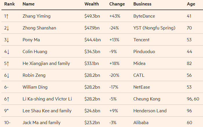 Возглавляет список основатель ByteDance Чжан Имин, который с состоянием в $49,3 млрд вырвался на первое место, обойдя «короля бутилированной воды» Чжун Шаньшаня. Новоиспеченные миллиардеры представляют собой «новое поколение предпринимателей в Китае, которое гораздо более интернационально, чем их предшественники», говорится в докладе Hurun.