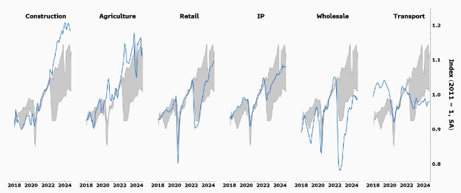 Большинство базовых секторов достигли пика между 4 кварталом 2023 года и 2 кварталом 2024 года — хотя сильные розничные продажи и устойчивая уверенность потребителей остаются исключениями. Экономика, вероятно, продолжит сокращаться в следующих кварталах, поскольку решение Банка России повысить процентную ставку до 21% ограничивает доступ частного сектора к кредитам.