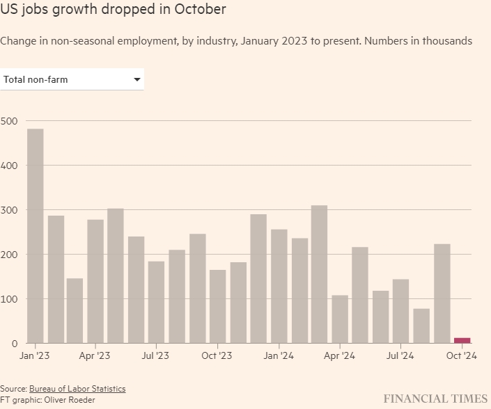 В октябре экономика Соединённых Штатов Америки пополнилась лишь 12 тысячами новых рабочих мест, что стало самым слабым отчётом администрации Байдена о занятости. Это число сильно пострадало из-за ураганов и забастовки в компании Boeing.
