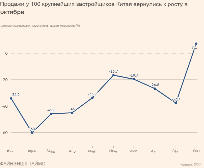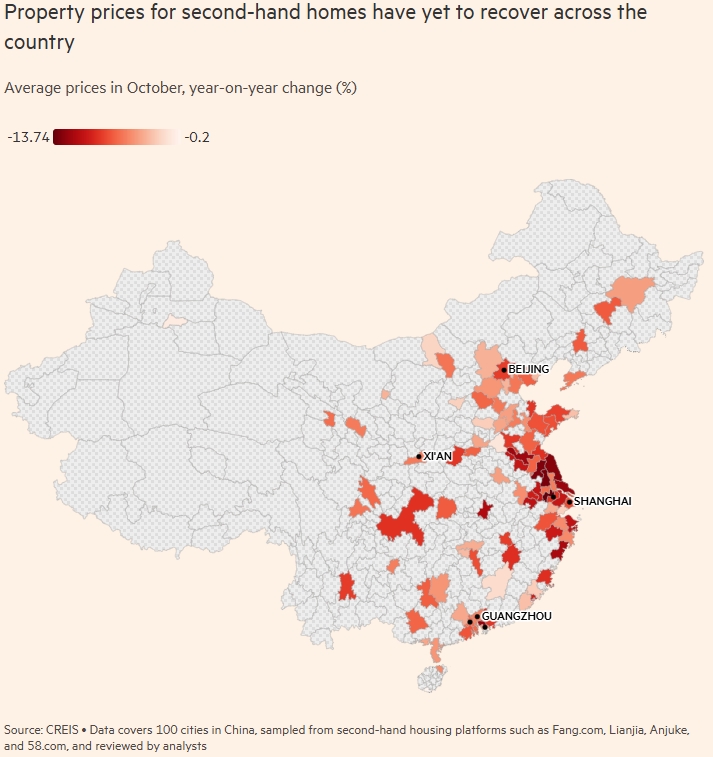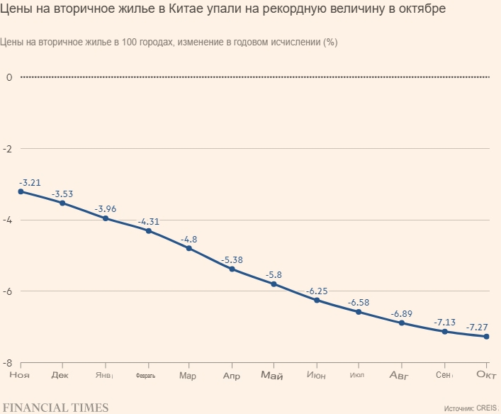 Это способствовало переходу к покупке существующего жилья, где более рыночное падение цен сделало покупку более привлекательной. Данные China Index Academy показали, что цены на вторичное жильё в 100 городах упали на 7,27% в годовом исчислении в октябре, что является самым высоким показателем за всю историю.