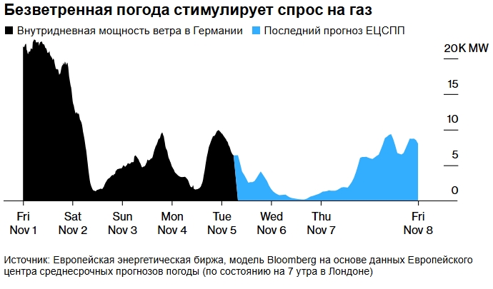 Из-за снижения производства возобновляемой энергии в Европе на этой неделе, а также из-за риска шторма, спрос на газ временно увеличился. По данным модели Bloomberg, ветрогенерация в Германии должна достичь своего минимума, а в Великобритании она значительно упала.