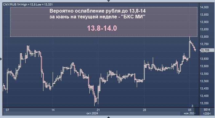 Вероятно ослабление рубля до 13,8-14 за юань на текущей неделе, говорится в обзоре "БКС Мир инвестиций" ("БКС МИ").