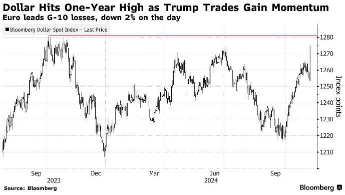 Рост доходности облигаций привлечет дополнительные средства в США, поскольку инвесторы будут стремиться получить более высокие доходы. Доллар резко вырос по отношению ко всем своим основным конкурентам, а индекс Bloomberg достиг самого высокого уровня с ноября 2023 года.