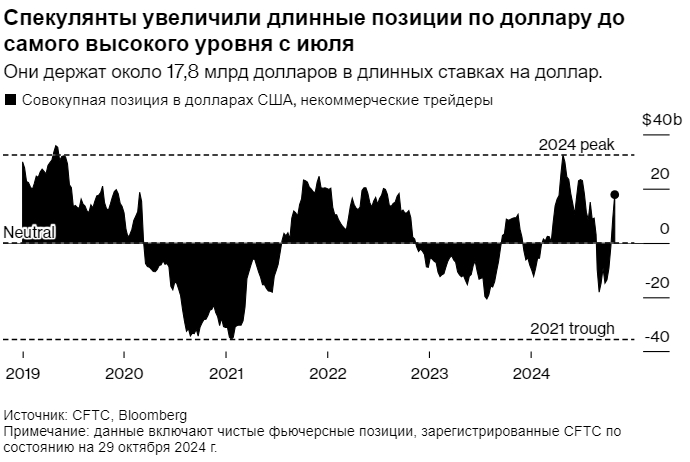 По состоянию на 29 октября хедж-фонды и другие спекулянты заняли позицию для дальнейшего роста курса доллара, также под влиянием спроса на активы-убежища в результате выборов. Эти фонды и другие спекулянты держат около 17,8 миллиардов долларов в длинных позициях по доллару, согласно данным Комиссии по торговле товарными фьючерсами, собранным Bloomberg.