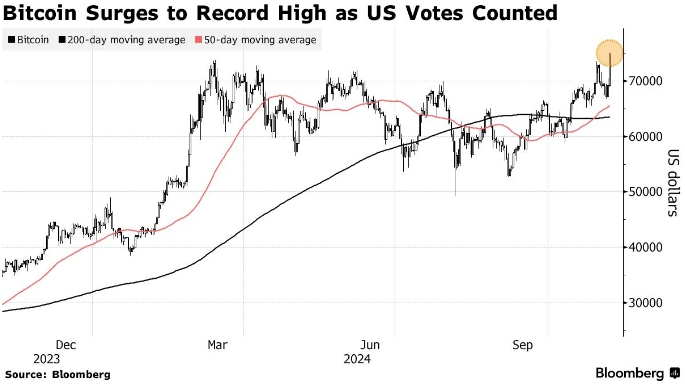 Биткоин достиг рекордного уровня, что стало частью волны торгов на мировых рынках в ответ на результаты выборов в США. Кандидат от Республиканской партии Дональд Трамп одержал победу над своим соперником от Демократической партии Камалой Харрис.