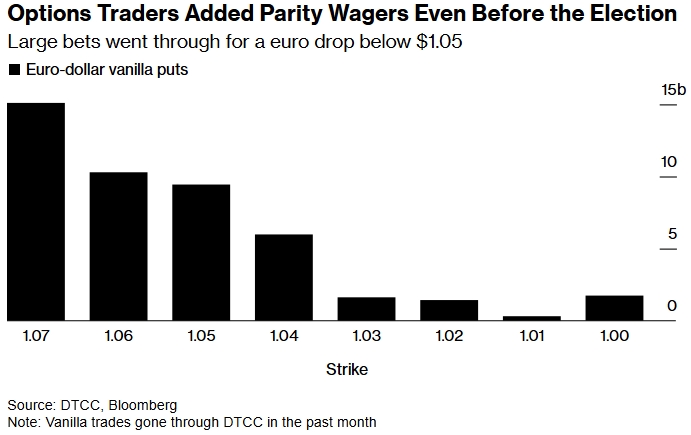 Опционные трейдеры увеличилис ставки на то, что евро упадет до паритета, еще до выборов. Крупные ставки были сделаны на падение евро ниже $1,05. Евро/долларовые ванильные путы. Источник: DTCC, Bloomberg. Примечание: ванильные опционы, которые прошли через DTCC за последний месяц