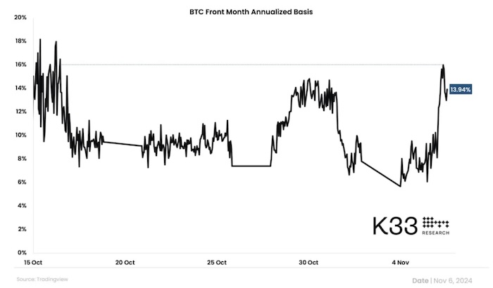 Фьючерсные контракты на биткоин на бирже деривативов CME — один из самых популярных способов для институциональных инвесторов в США зарабатывать на бычьем рынке. Так называемый базис, который представляет собой разницу между спотовой ценой и ценой фьючерсных контрактов, был невелик в последние дни перед выборами. Между тем бессрочные фьючерсные контракты — популярная опция для офшорных инвесторов — привлекают больше интереса за счет высокой ставки финансирования, что указывает на растущий спрос на кредитное плечо на этом рынке.