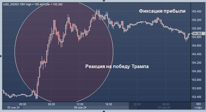 Победа Трампа также усиливает предположения о том, что ФРС может снижать ставки более медленно и незначительно. Это связано с тем, что политика Трампа по ограничению нелегальной иммиграции и введение новых тарифов могут привести к росту инфляции.