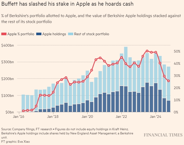 Баффет сократил свою долю в Apple, поскольку копит деньги. Процентная доля портфеля Berkshire, выделенного под бумаги Apple, и стоимость акций Apple по сравнению с остальной частью портфеля акций Berkshire. Источник: документы компании, исследование FT. Цифры не включают акционерный капитал Kraft Heinz. Активы Apple, принадлежащие Berkshire, включают акции, принадлежащие New England Asset Management, подразделению Berkshire. Графика FT: Ева Сяо