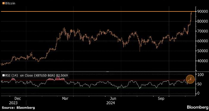 Криптовалютный флагман подскочил в цене примерно на 32% после выборов в США, 5 ноября, и достиг исторического максимума в $89 599 утром 12 ноября.