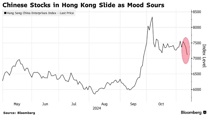 Индекс Hang Seng China Enterprises достиг рекордного падения за месяц, а CSI 300 упал на 1,7%. Офшорный юань снизился на 0,3% до 7,25 за доллар, что является самым низким показателем за последние три месяца.