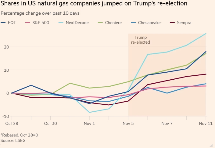 Акции американских газовых компаний подскочили после переизбрания Трампа. Процентное изменение за последние 10 дней. *Пересчитано, 28 октября=0. Источник: LSEG