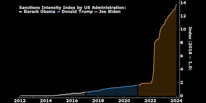 Индекс интенсивности антироссийских санкций при Бараке Обаме (белым), Дональде Трампе (голубым) и Джо Байдене (оранжевым). Источник: Bloomberg