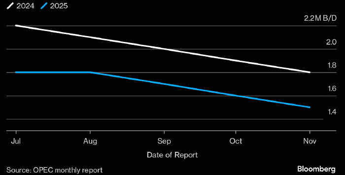 Прогноз ОПЕК по росту мирового спроса на нефть в 2024 (белым) и 2025 (голубым) годах в млн б/д. Источник: Bloomberg