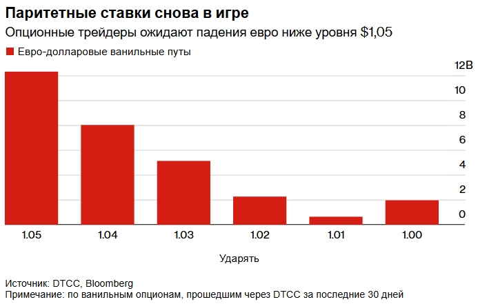 Рынок опционов также сигнализирует о слабости евро. Данные Depository Trust & Clearing Corporation показывают, что в прошлом месяце было поставлено около €2 млрд на ванильные опционы на падение евро до $1 в следующем году.