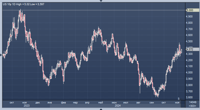 После победы Трампа доходность государственных облигаций резко выросла на фоне ожиданий, что его иммиграционная и протекционистская торговая политика приведут к инфляции и заставят Федеральный резерв повысить ставки. В среду, на следующий день после выборов, 10-летние облигации выросли на 21 базисный пункт до 4,47%.