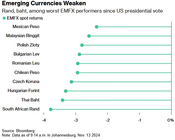 Развивающиеся валюты слабеют. Рэнд и бат оказались среди худших показателей EMFX после президентских выборов в США. Источник: Bloomberg. Примечание: данные по состоянию на 9:14 утра в Йоханнесбурге, 13 ноября 2024 г.
