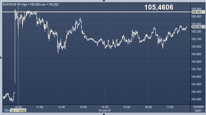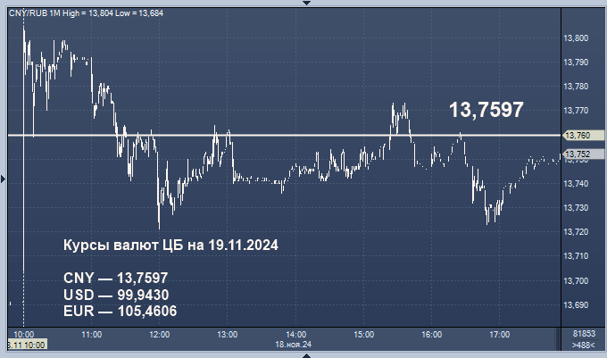 Китайский юань растет на Московской бирже днем в понедельник. Рубль дешевеет на фоне новых геополитических рисков после того, как СМИ сообщили, что президент США Джо Байден санкционировал применение украинскими военными ракет ATACMS для нанесения ударов по российской территории, пишет Интерфакс. Торги долларом и евро не проводятся на Московской бирже с 13 июня из-за санкций. В связи с этим наиболее подходящими ориентирами колебаний курса (в том числе для внебиржевого рынка) являются котировки однодневного фьючерсного контракта с автопролонгацией на курс "доллар США - российский рубль" (USDRUBF) и такого же контракта на курс "евро - российский рубль" (EURRUBF).