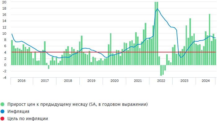 Поэтому для замедления темпов роста спроса, возобновления дезинфляционного процесса, снижения инфляционных ожиданий и создания условий для устойчивого замедления инфляции «требуется дополнительная жесткость денежно-кредитных условий». С учетом текущего курса ДКП, Банк России ожидает, что в 2025 году инфляция замедлится до 4,5–5,0% г/г, в 2026 году — до 4,0% г/г, и в дальнейшем будет находиться около 4% г/г.
