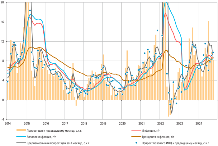 В октябре потребительская инфляция в РФ замедлилась относительно сентября (в базе год к году — прим.), тем не менее инфляционное давление остается около максимумов текущего года. Поэтому достижение цели по инфляции в 4% требует дополнительной жесткости денежно-кредитных условий, говорится в опубликованном сегодня вечером обзоре регулятора «Динамика потребительских цен».