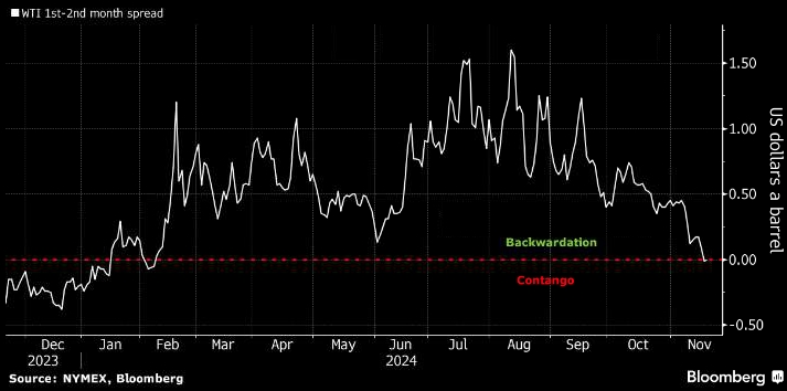 Цены на нефть все еще ниже на 3–4% уровней, которые были на начало 2024 года. Опасения по поводу китайского спроса и избытка мирового предложения сказываются на перспективах. Быстрый спред для WTI — разница между двумя ближайшими фьючерсными контрактами — впервые с февраля стал демонстрировать контанго, что является медвежьей структурой фьючерсного рынка.