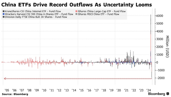 Так, биржевой фонд iShares China Large-Cap ETF, известный по тикеру FXI, зафиксировал отток средств в размере 984 миллионов долларов на прошлой неделе, что стало рекордным показателем за всю историю существования фонда. Это стало продолжением пятинедельной серии изъятий средств.