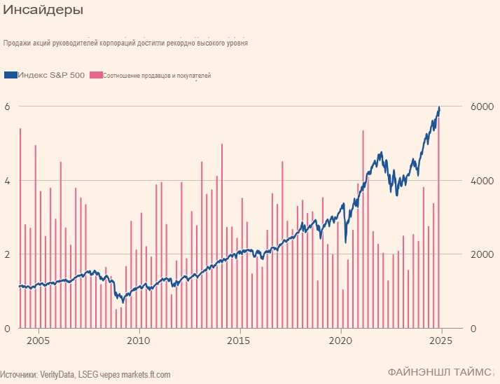 По данным VerityData, объём продаж инсайдеров достиг рекордного уровня за последние два десятилетия. Продажи руководителей компаний из индекса Wilshire 5000 включают в себя как единичные сделки по фиксации прибыли, так и регулярные продажи, инициированные автоматическими торговыми планами руководителей.