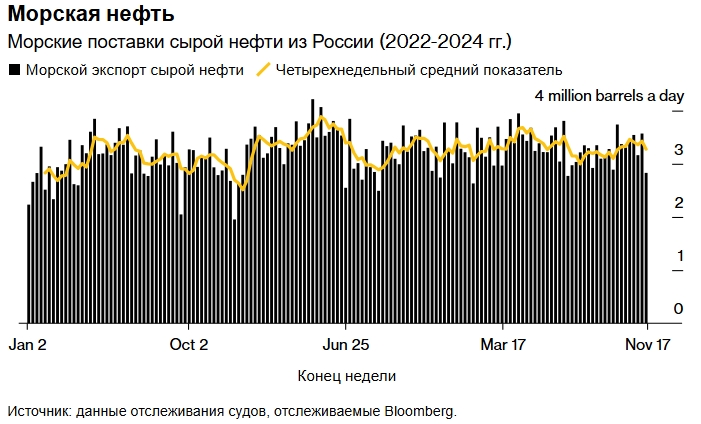 В период до 17 ноября поставки российской нефти на экспорт упали примерно на 150 000 баррелей в сутки по сравнению с предыдущей неделей. Это связано с самым значительным снижением еженедельного экспорта с начала июля.